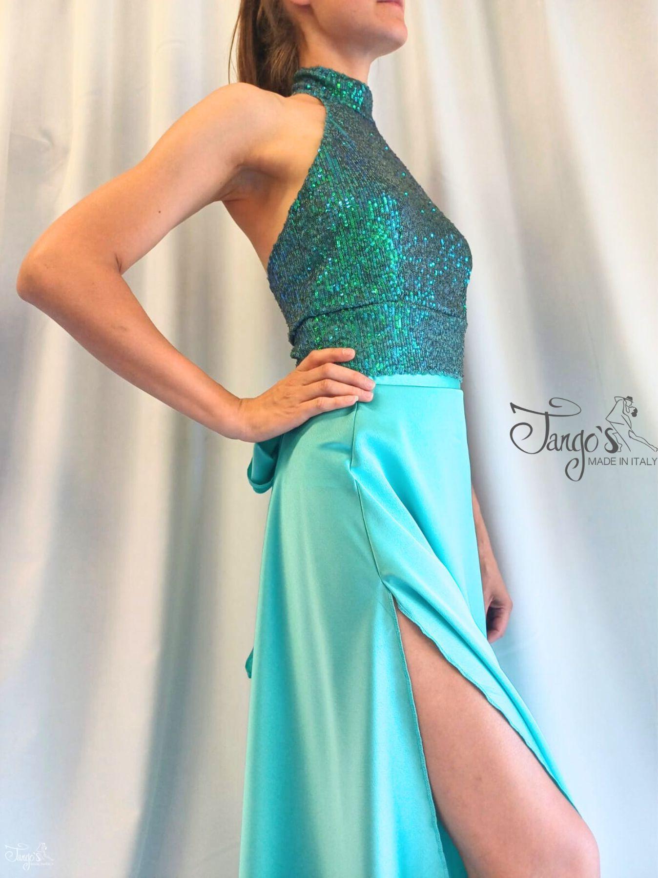 Orfea wrap skirt made of lightweight aquamarine satin, with a tie at the back or side.