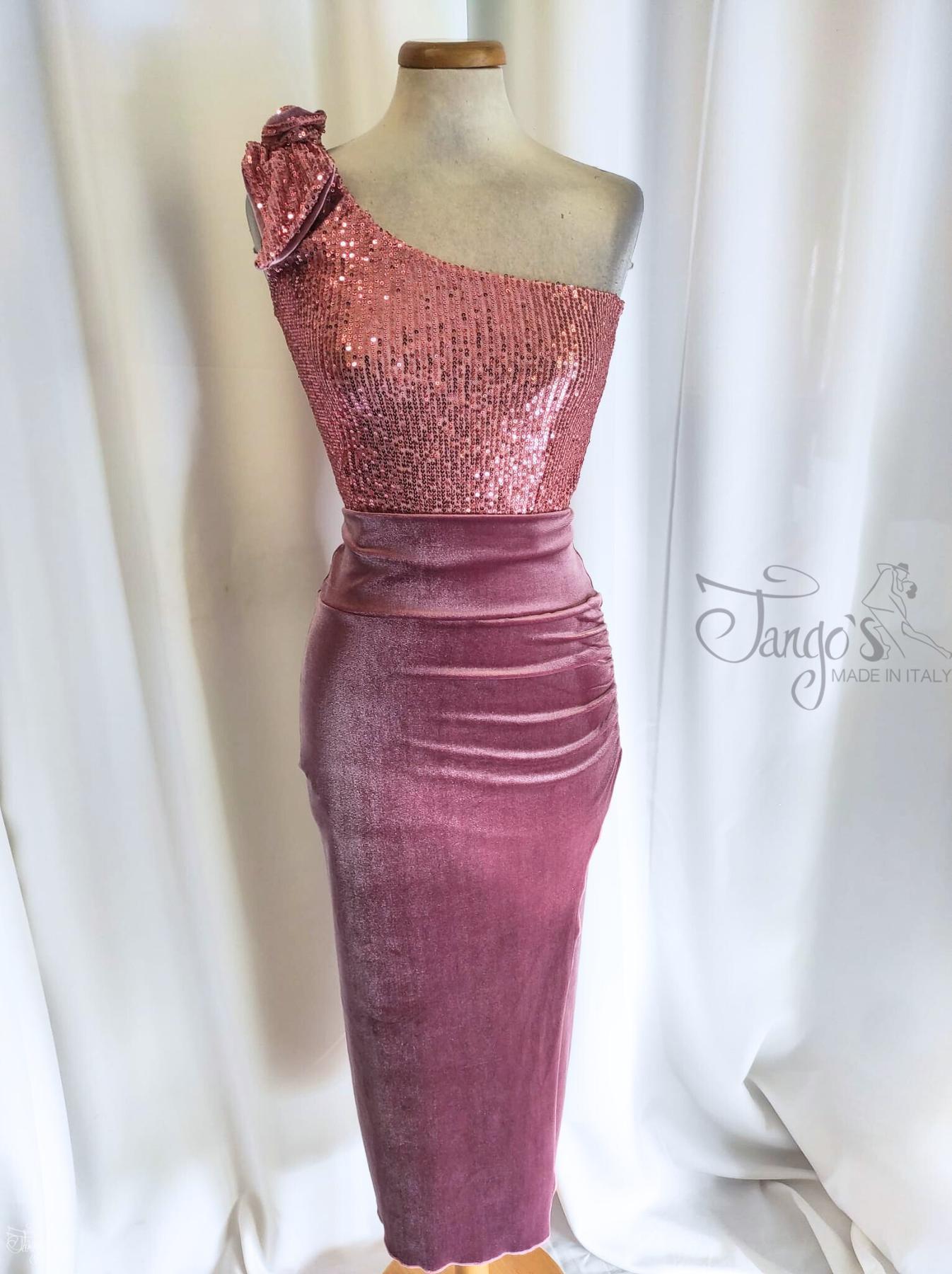 Carmen pencil skirt in stretchy antique pink velvet with a slight side ruffle. It features a back slit and a front opening.