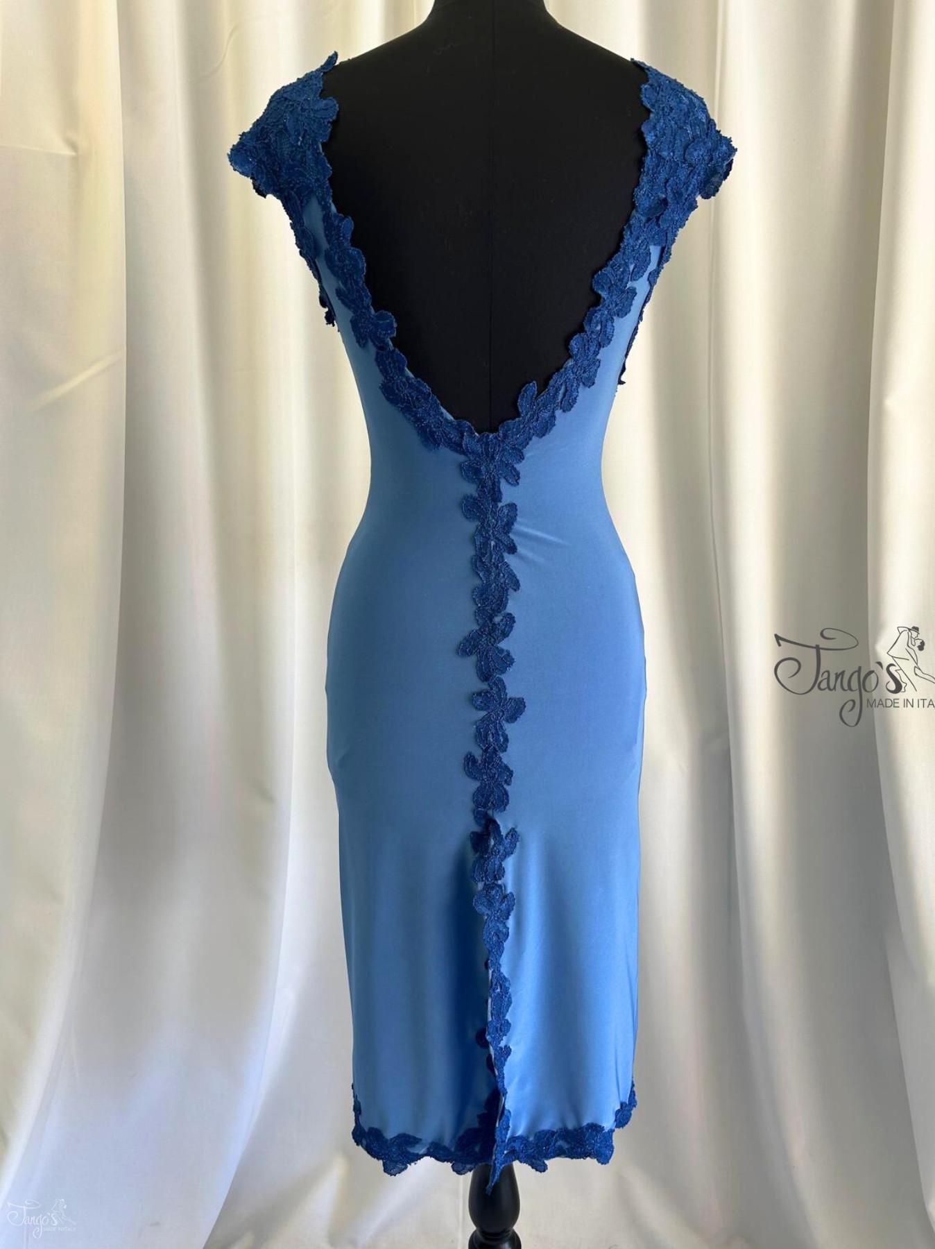 The back features a deep V-neckline embellished with an elegant lace trim that flows down the back to the hem.