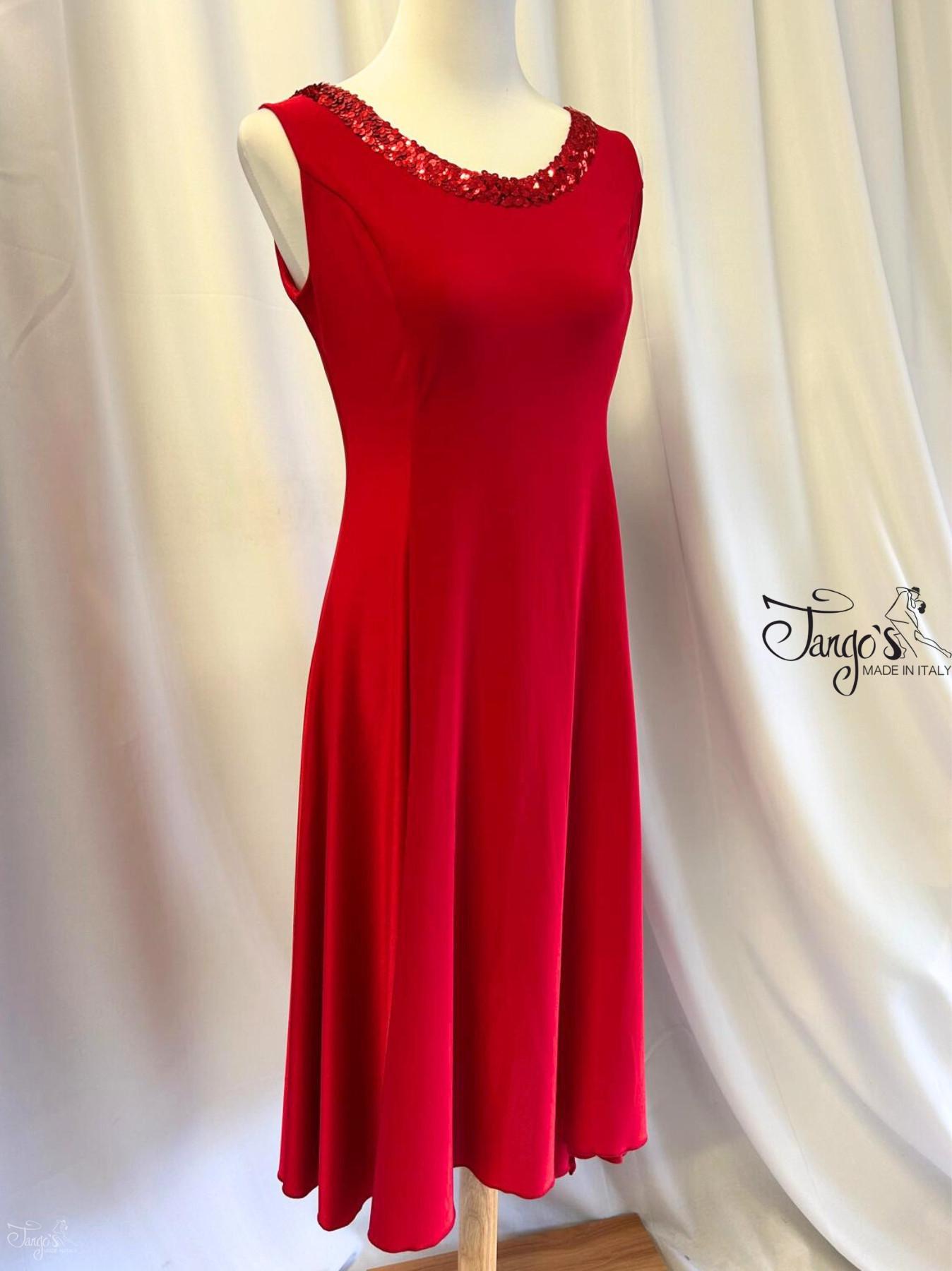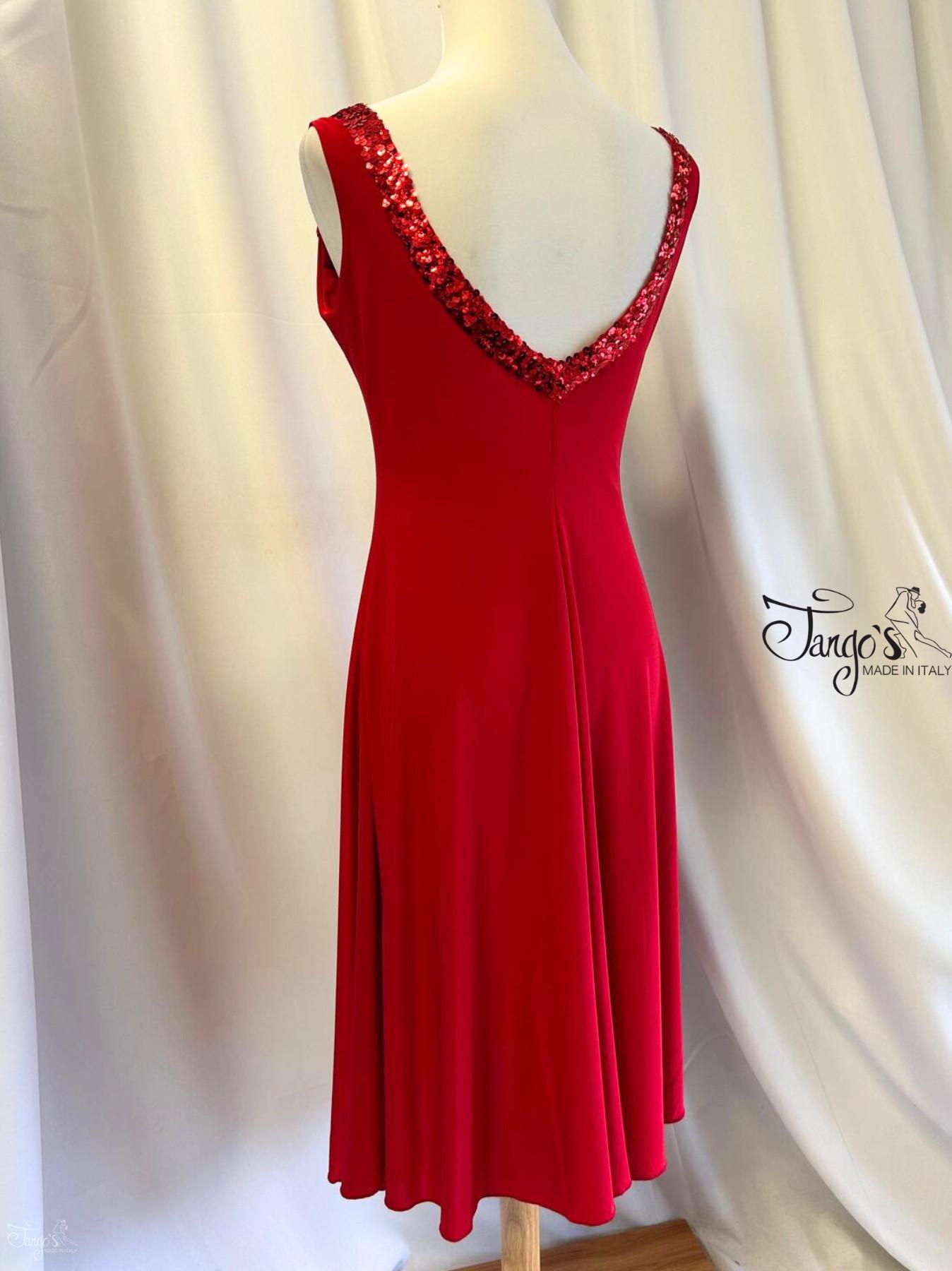 Abito realizzato in tessuto rossa scollato sia davanti che dietro e rifinito con paillettes, gonna dal taglio svasato con spacchi.