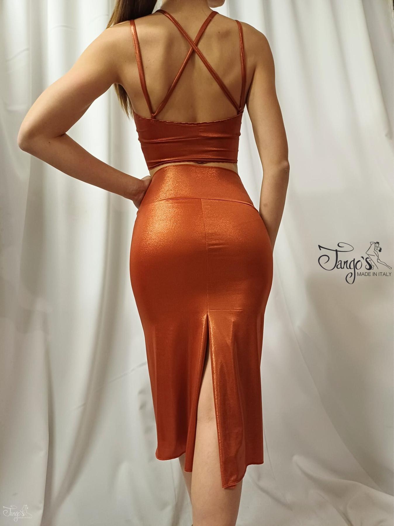 Lucy crop top, V-neckline and distinctive crossover back, made of orange laminated fabric.