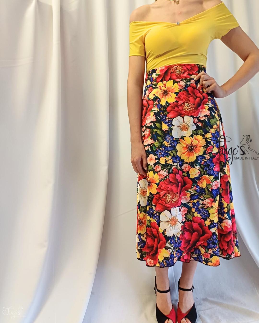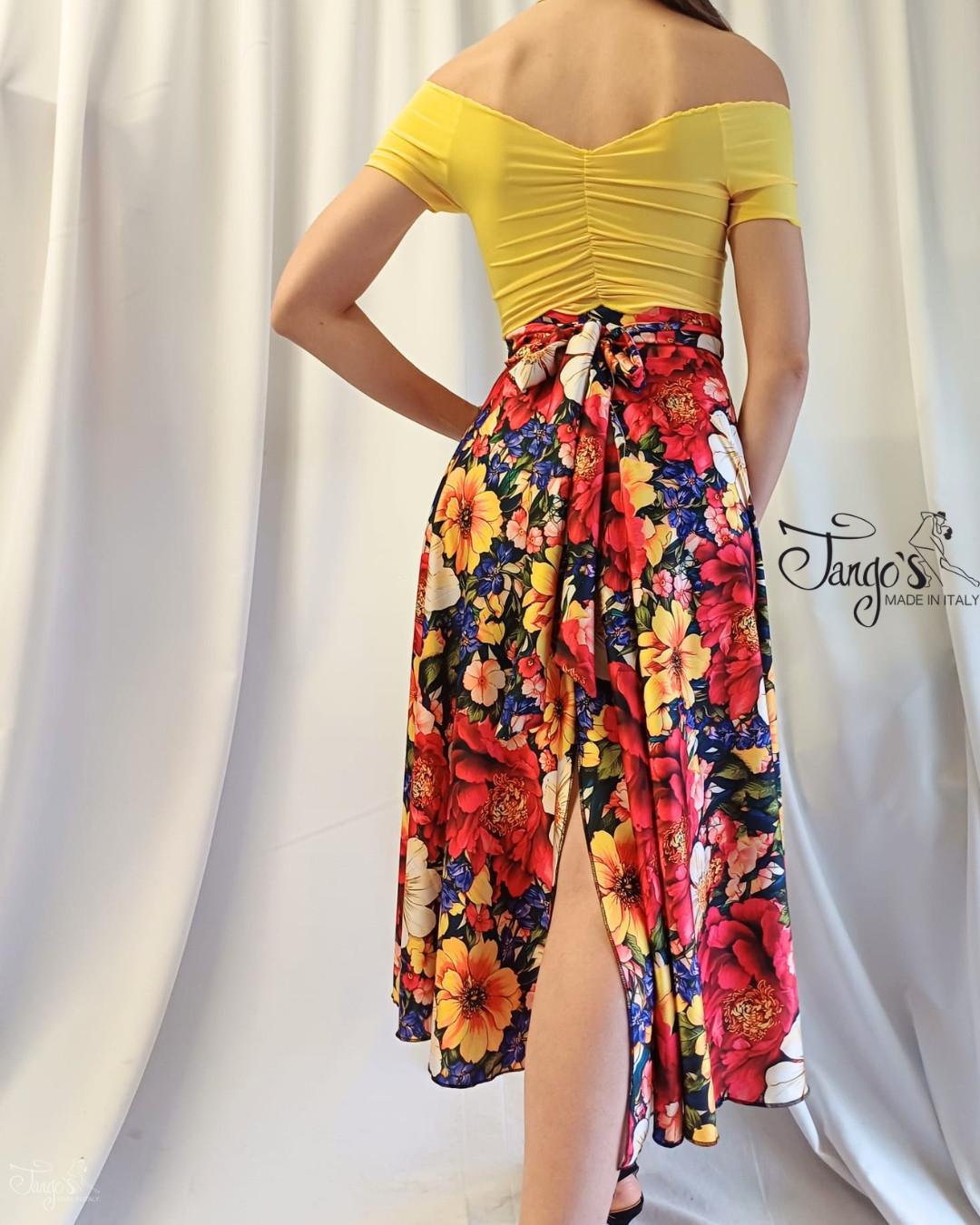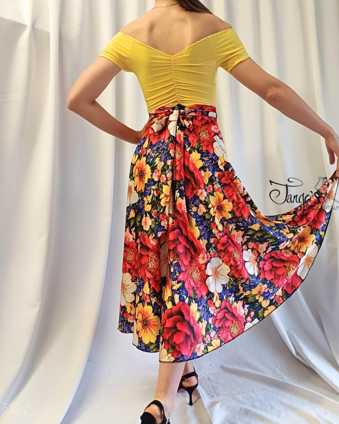 Dafne skirt made of soft black polka-dot tulle with an orange stretch jersey lining, a low neckline, and ruffles above the shoulders.