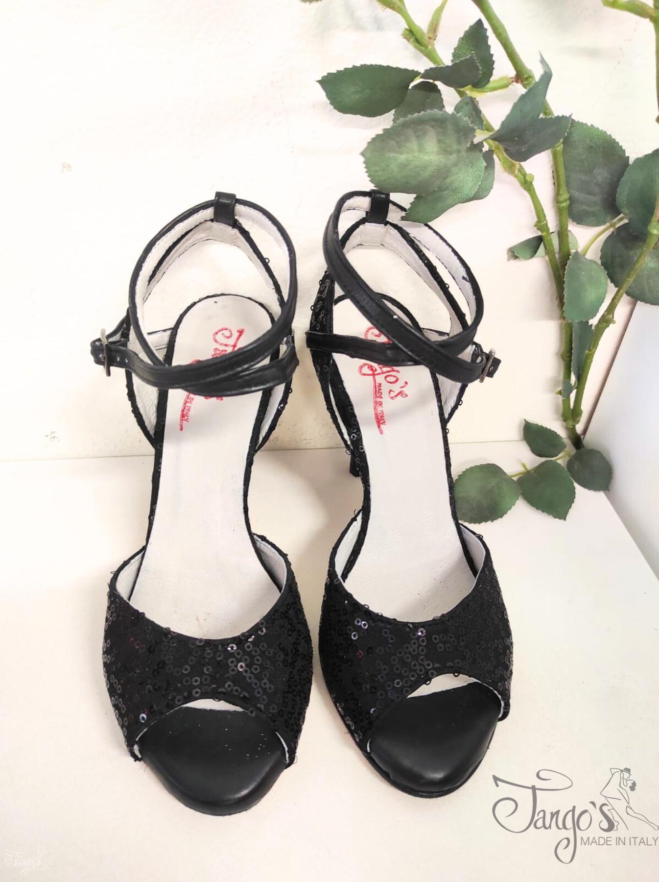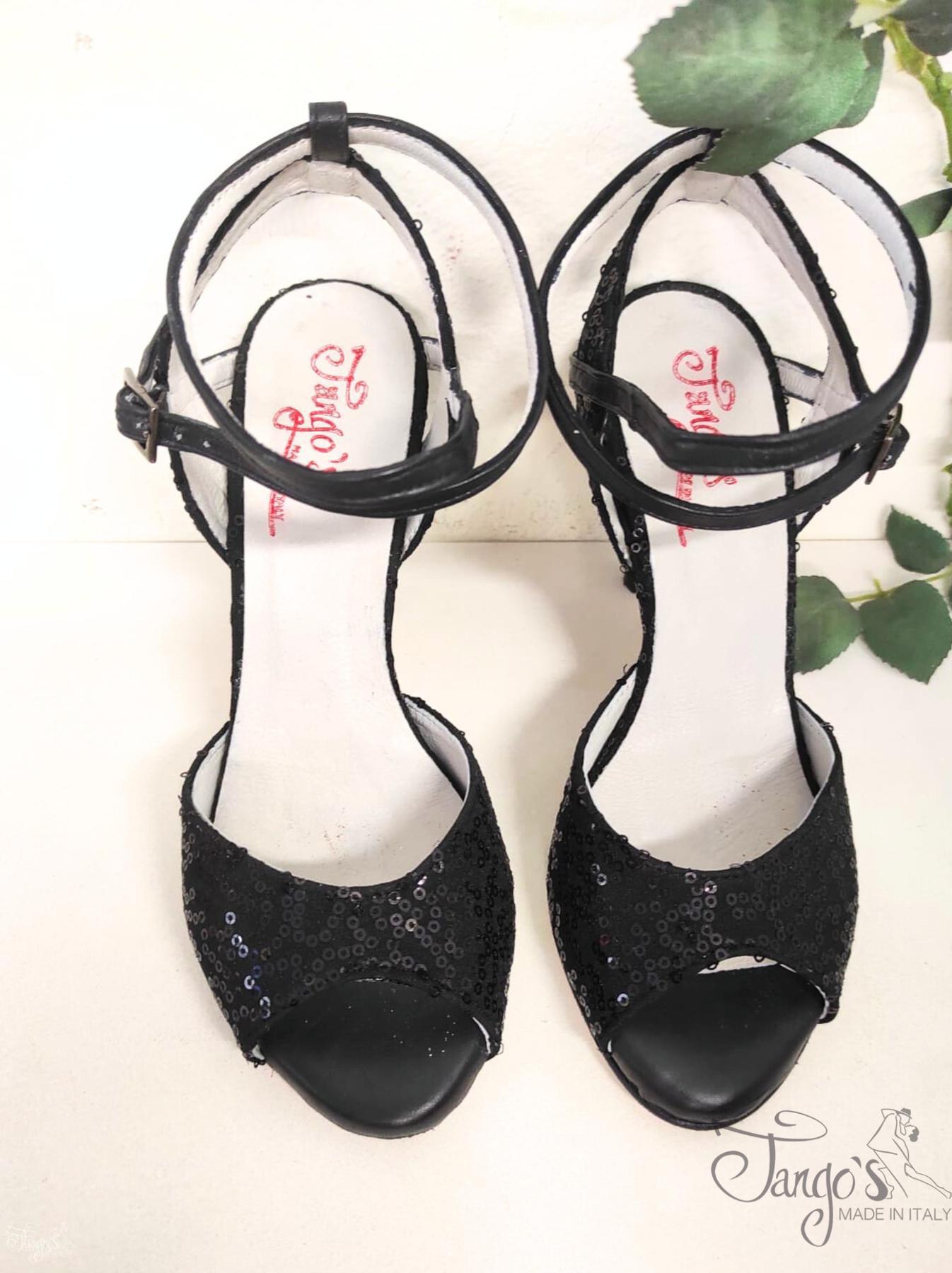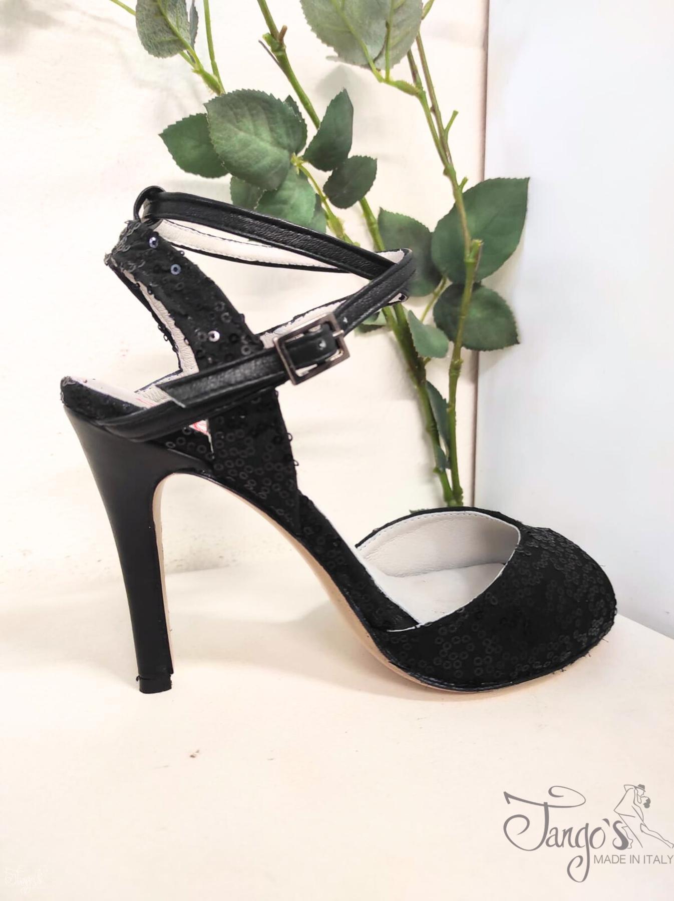 Scarpa realizzata con tessuto nero con ricami di paillettes di colore nero, totalmente rivestita internamente con vera pelle.