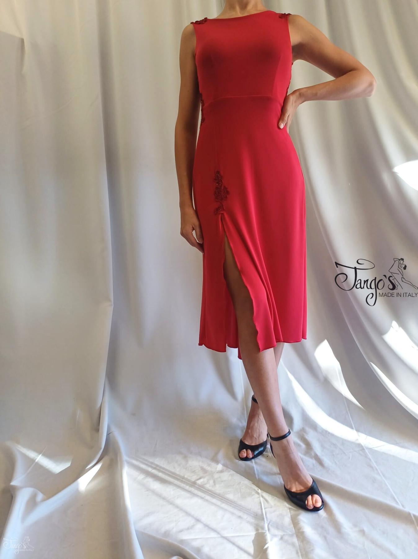 Abito realizzato in jersey elasticizzato con arriccitura posteriore e profonda scollatura sulla schiena a X con pizzo nella parte retro del vestito. Taglio a tubino con spacco posteriore. Applicazioni di ricami sul fianco sopra lo spacco e sulla spalla.