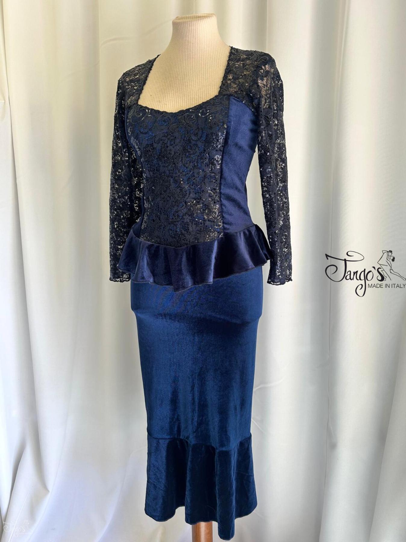 -Gonna a dal taglio aderente con ampio volant sul fondo e sul retro, interamente elasticizzata, realizzata in velluto blu