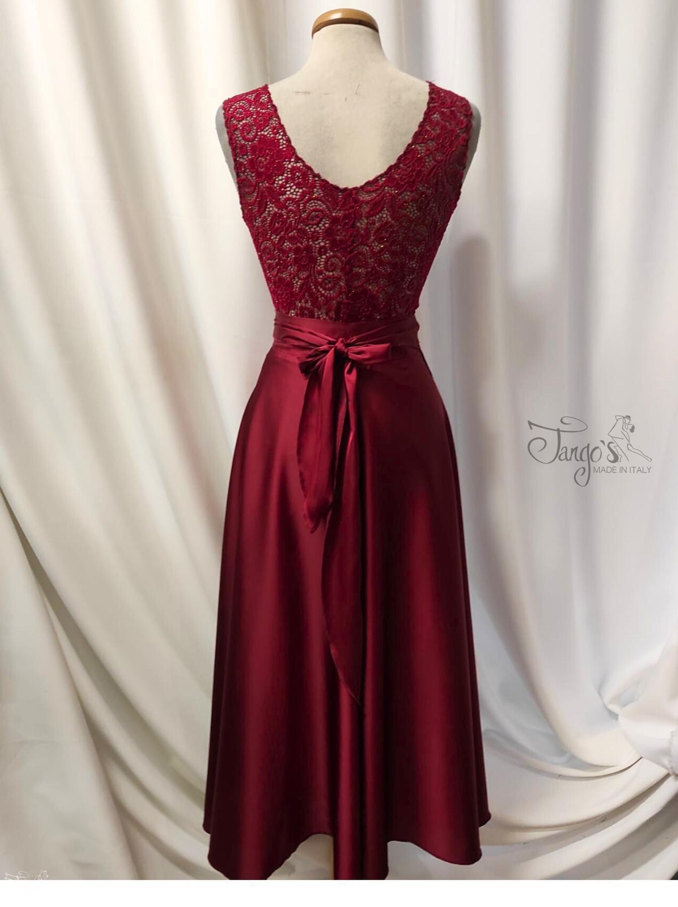 Gonna a portafoglio modello Orfea realizzata in raso leggero di colore rosso scuro con svasatura e coda posteriore , laccio da annodare in vita regolabile.