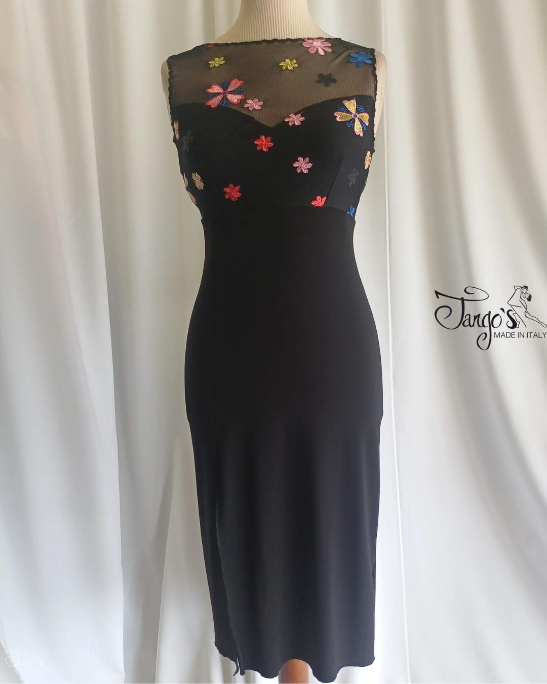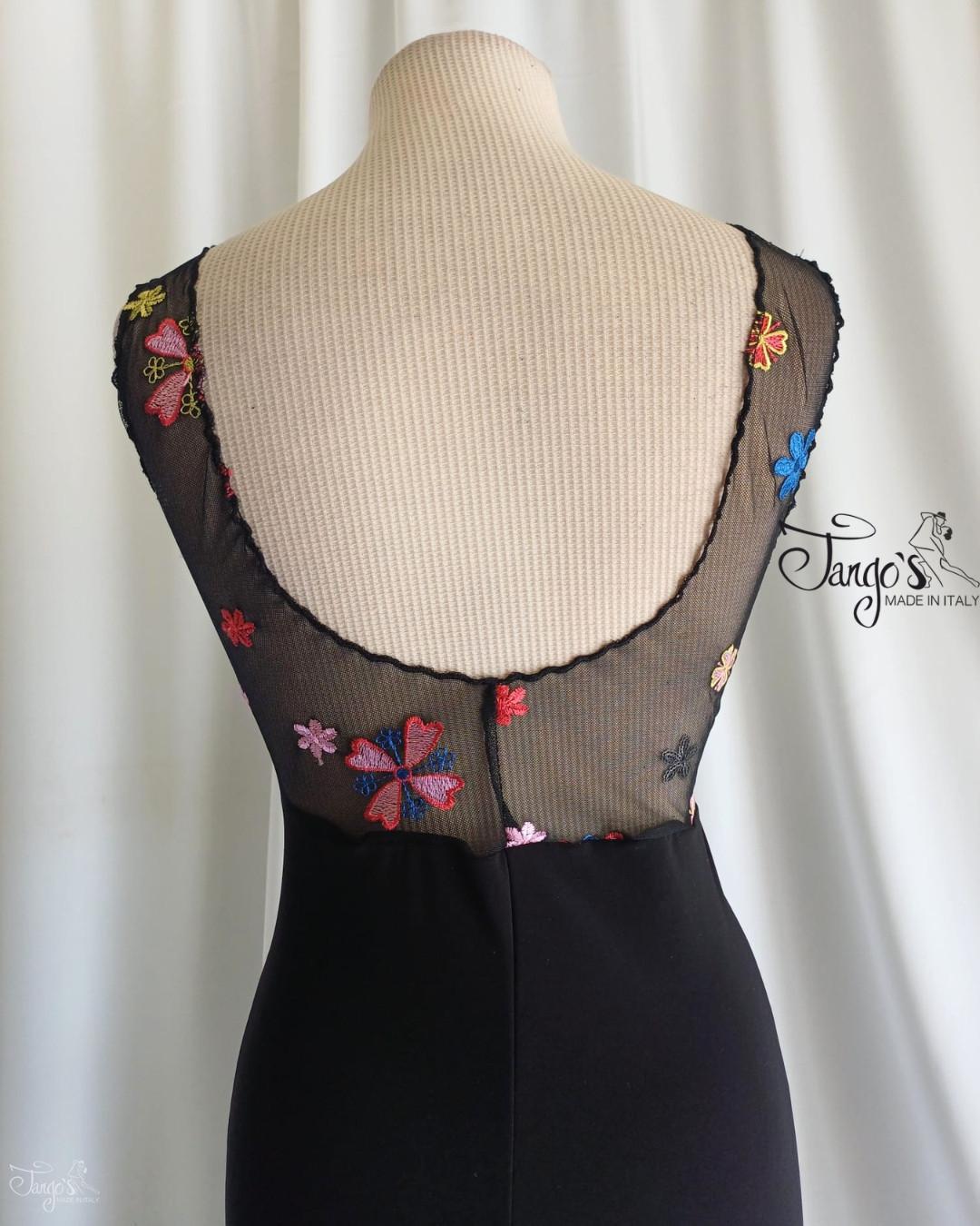 The Gennifer tango dress is a sheath dress made of stretch jersey. The top is made of floral tulle, lined in the front, and has a sweetheart neckline. The front features a scoop neckline and a deep scoop neckline in the back. The black skirt ends with a slit at the back and on the right leg.