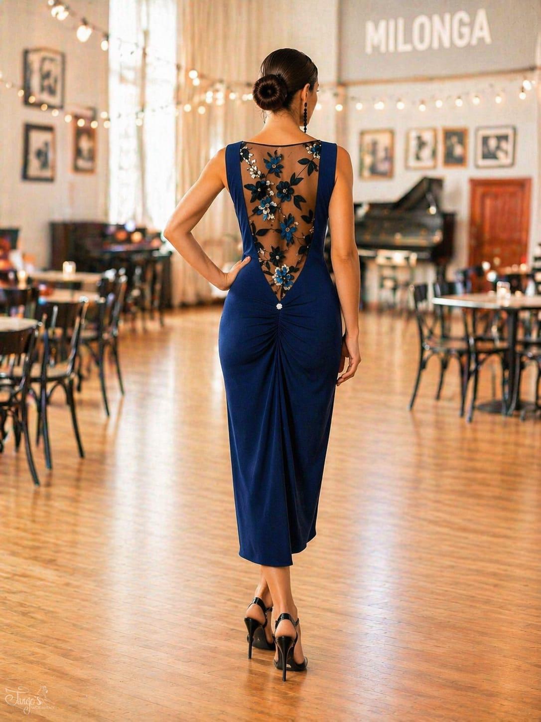 Sheath dress with a flared back and a slit for ease of movement. Gathered back.