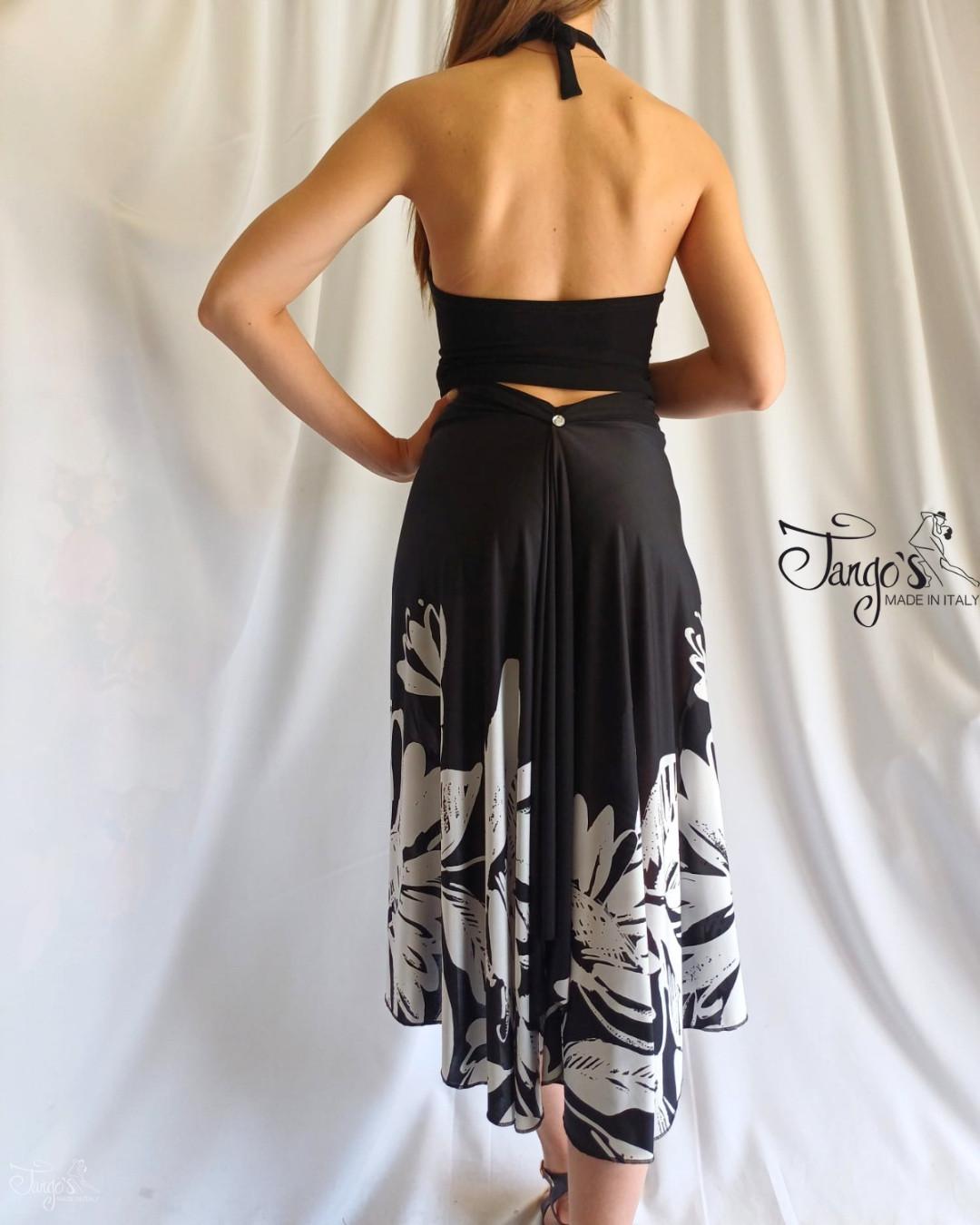 Dafne skirt made of soft black polka-dot tulle with an orange stretch jersey lining, a low neckline, and ruffles above the shoulders.