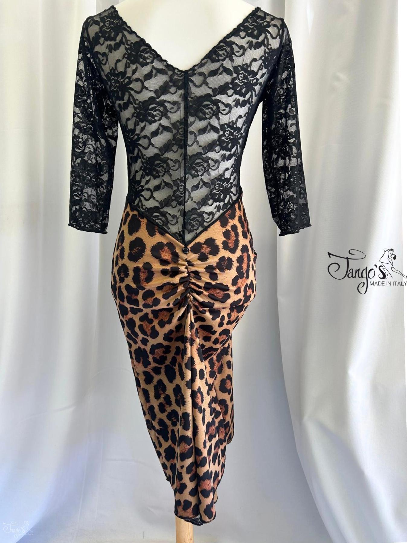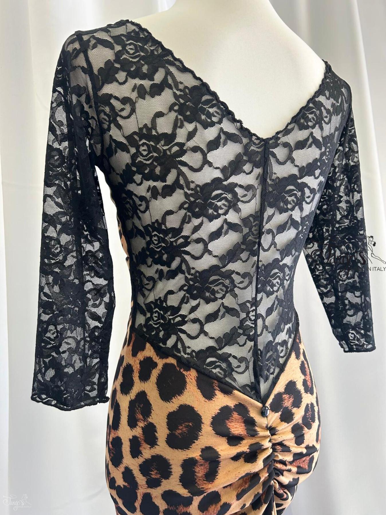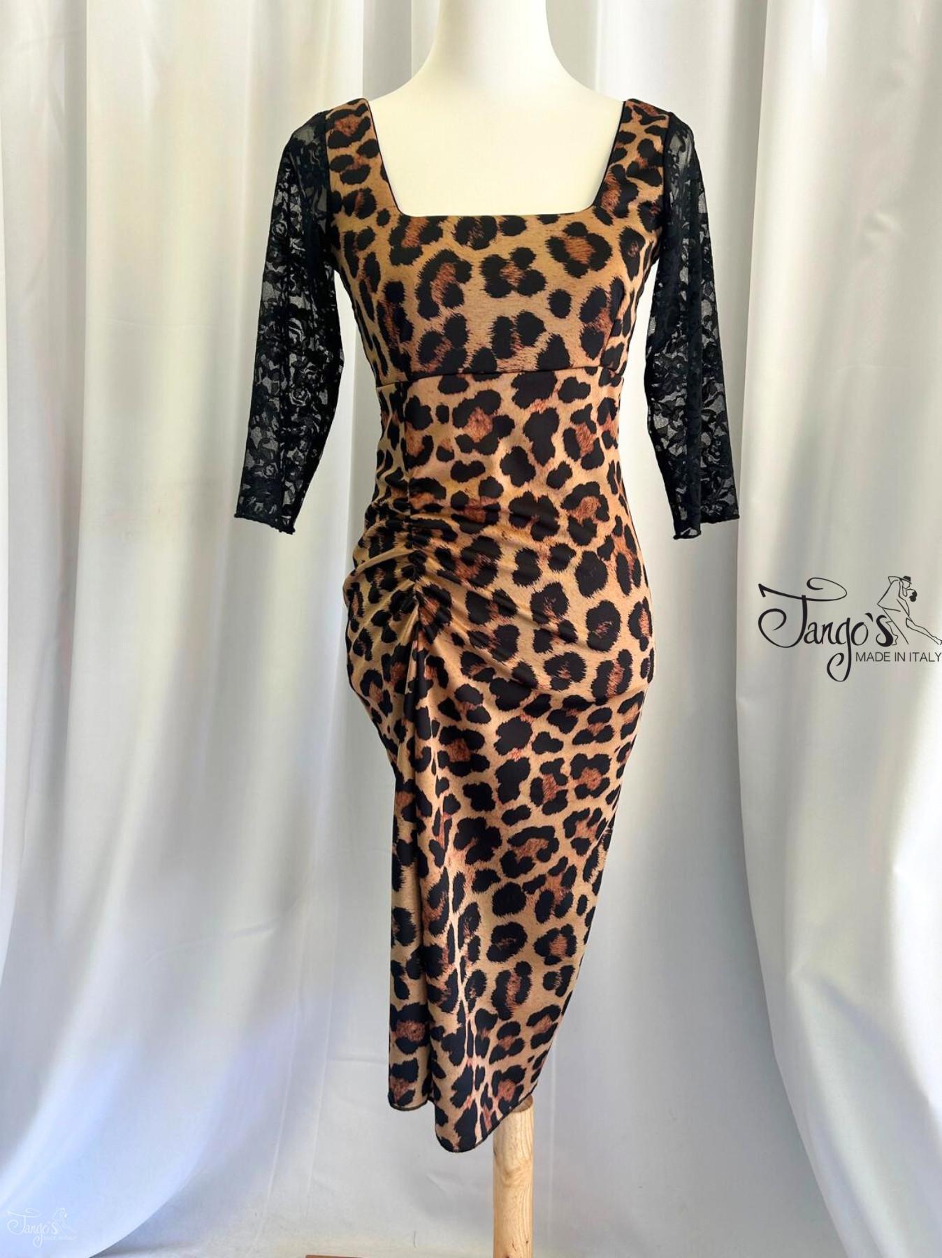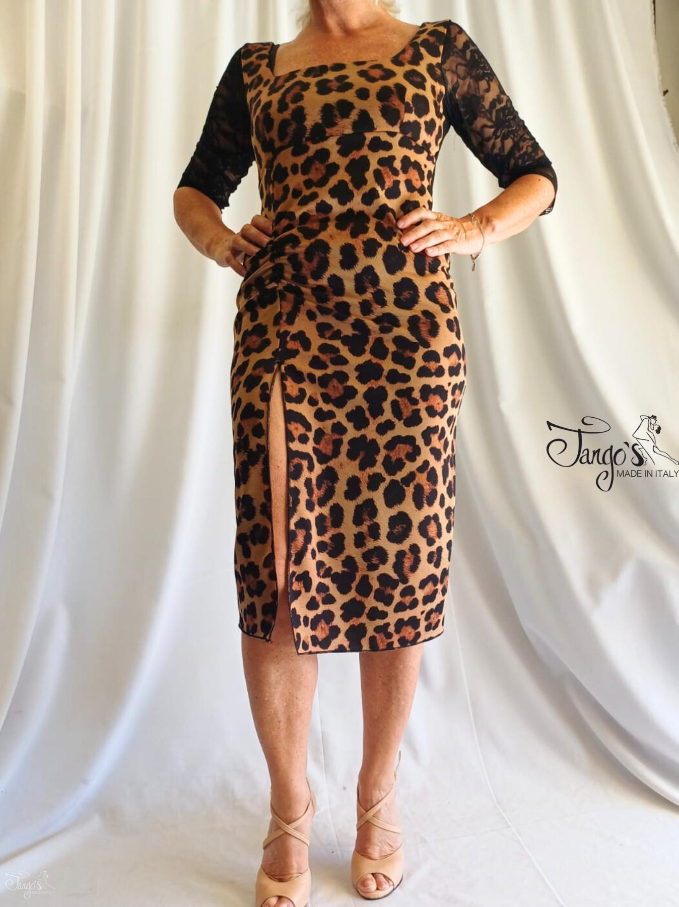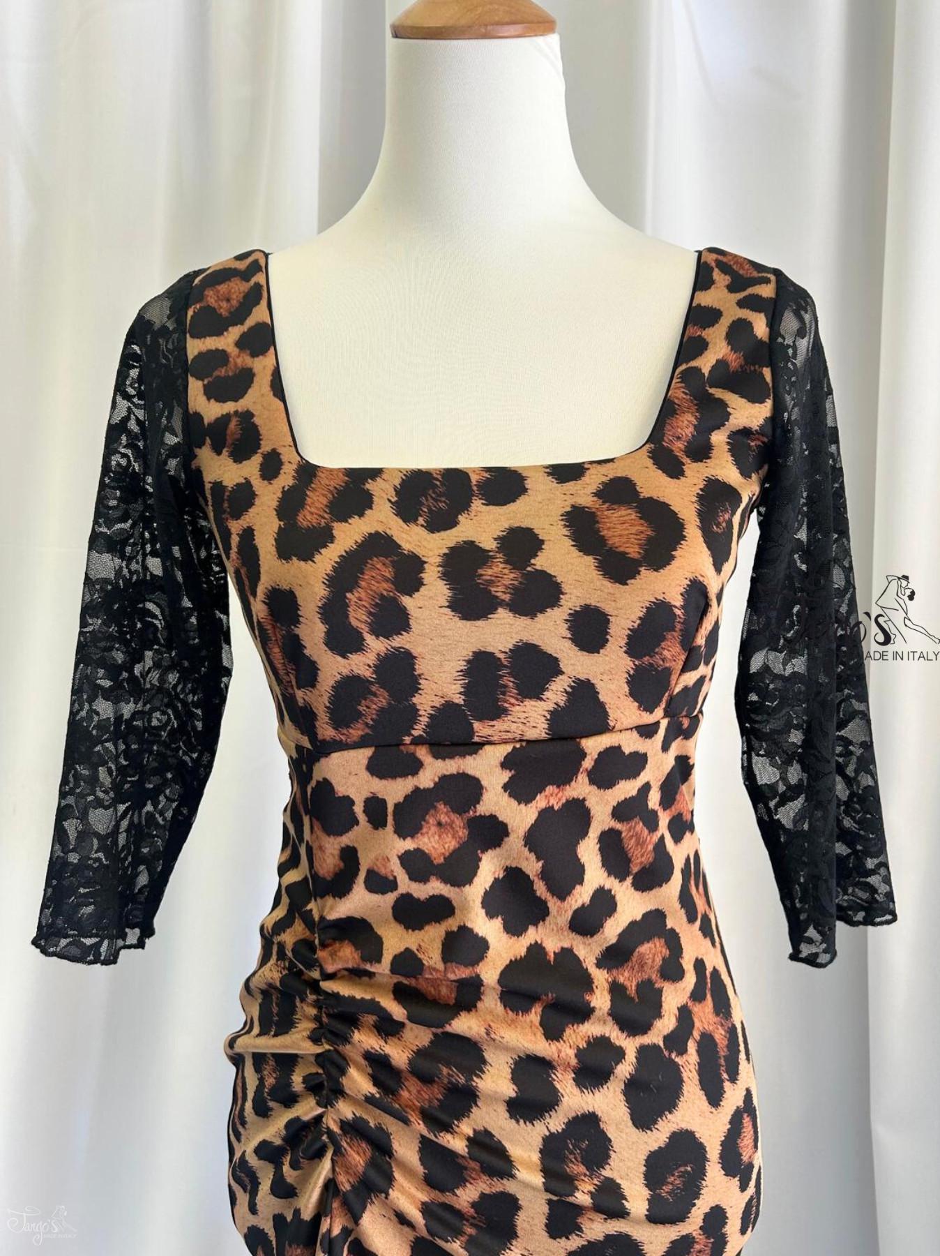 Abito in tessuto elasticizzato leopardato morbido e confortevole, scollo quadrato, nella parte anteriore scollo profondo in tulle nero, maniche a 3/4 anch'esse in pizzo.
