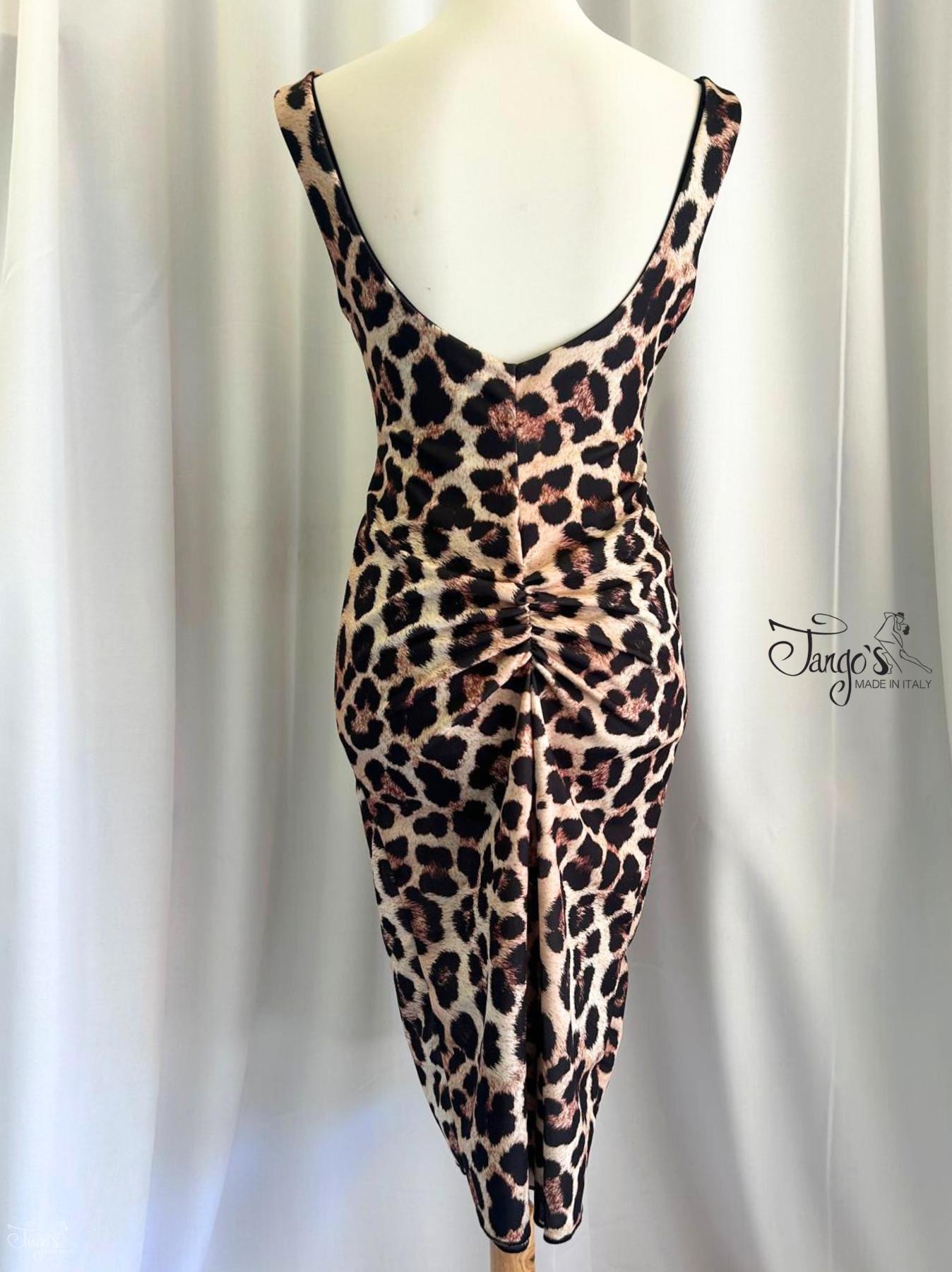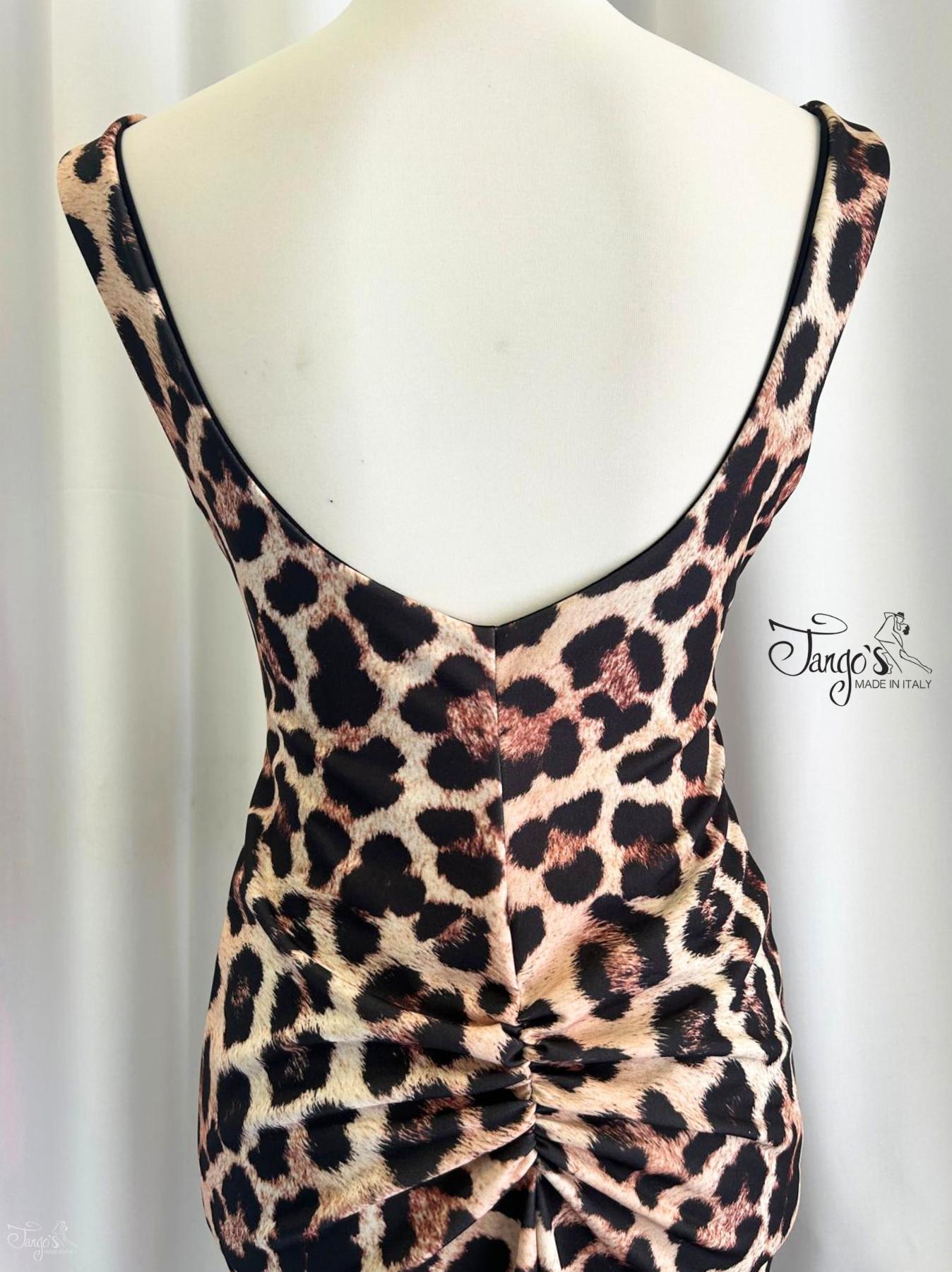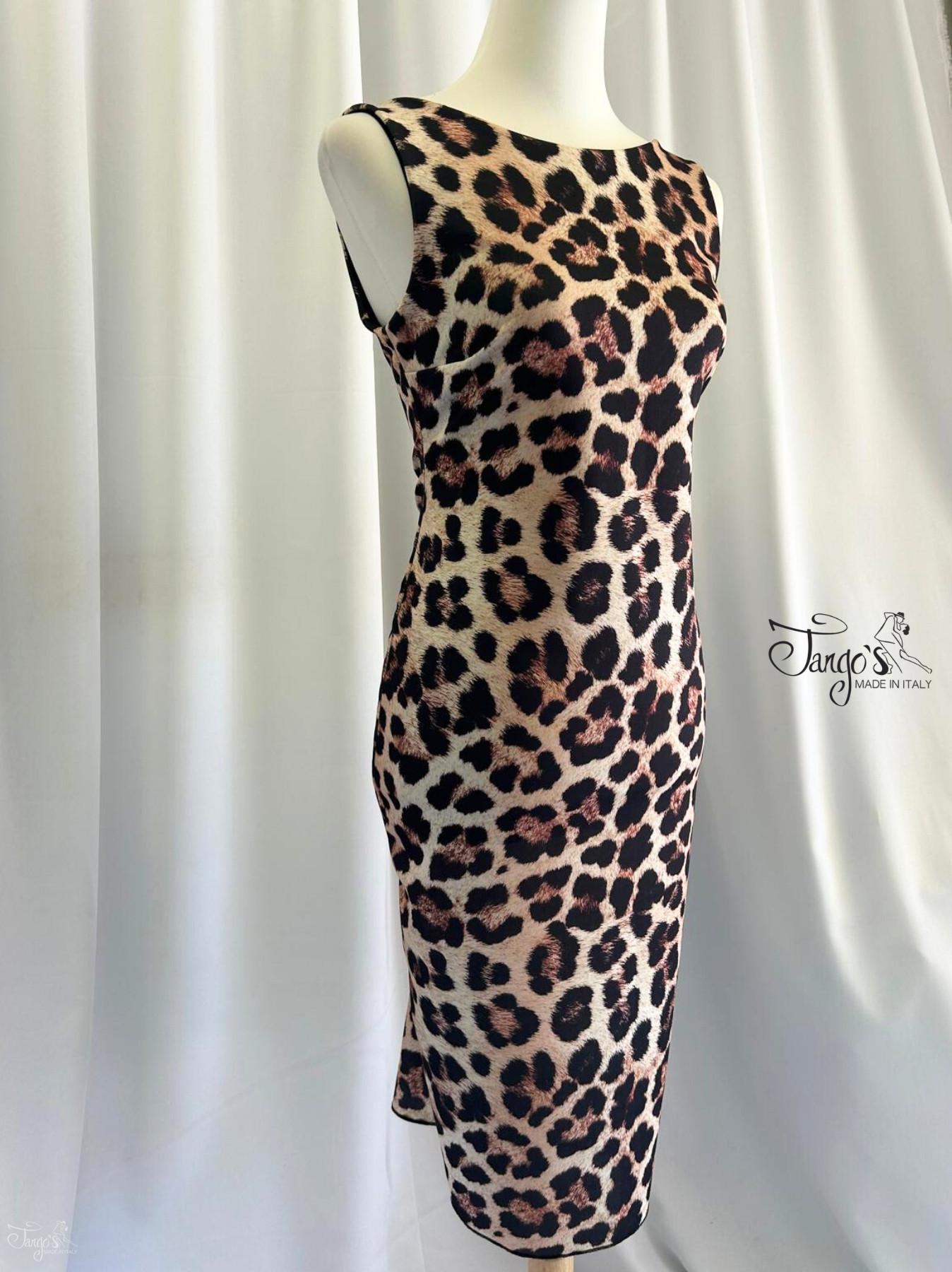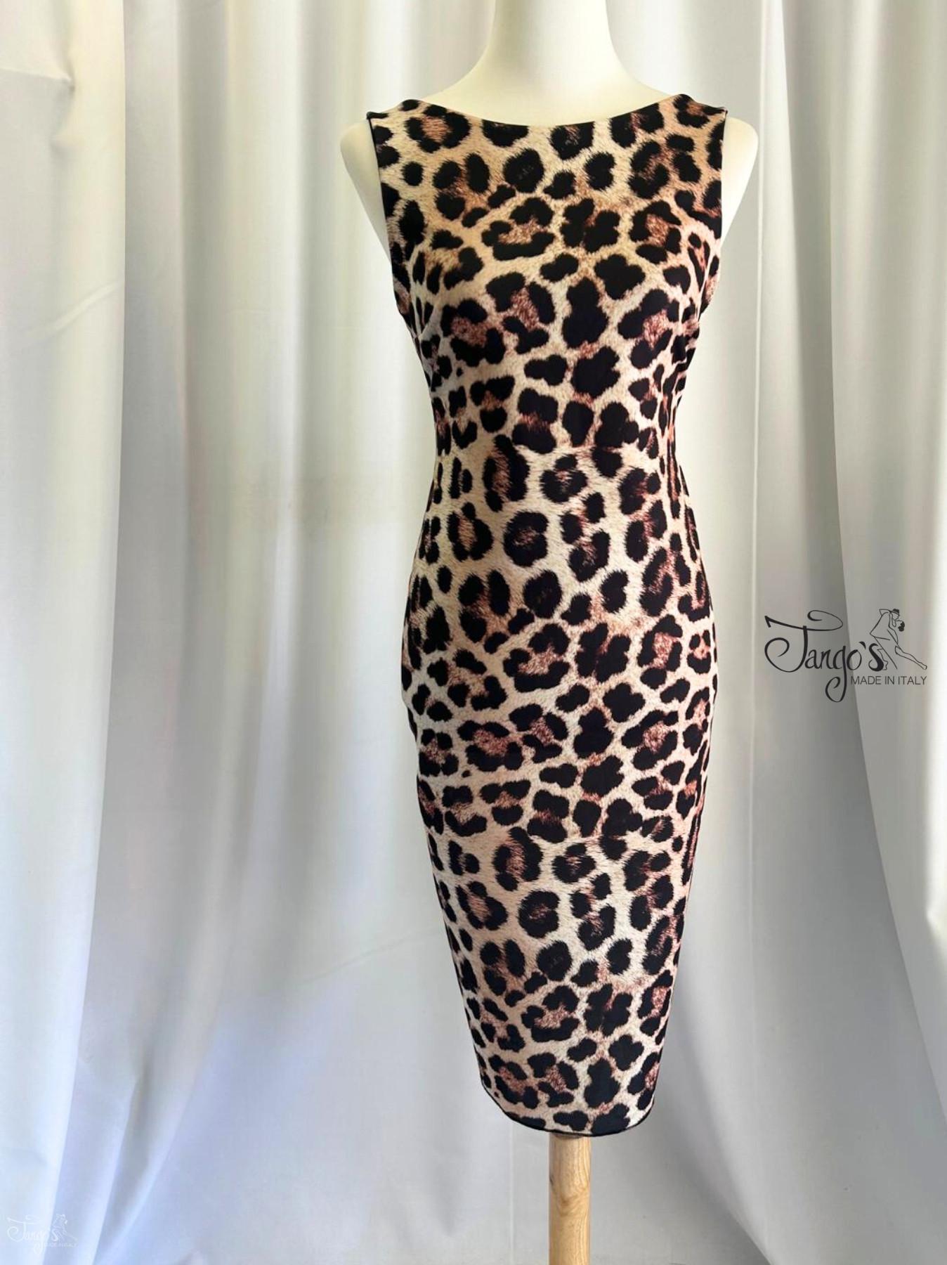 Abito realizzato in jersey elasticizzato fantasia maculata, scollo a barca e profonda scollatura posteriore. Spacco posteriore centrale. Abito elegante adatto per il ballo e per le uscite serali.