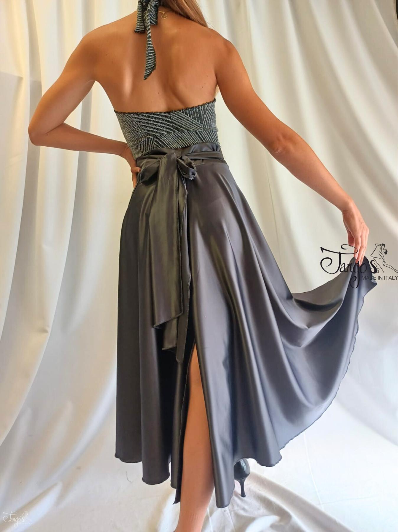 -Gonna a portafoglio color grigio scuro ampia con spacco posteriore, laccio da annodare in vita e regolabile. Modello lungo fino a metà polpaccio, inviaci la misura della lunghezza che preferisci.