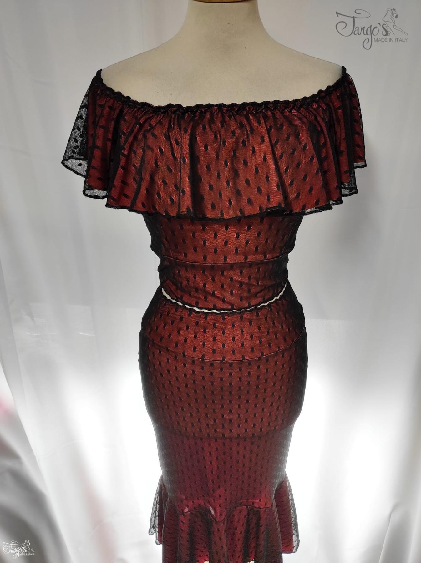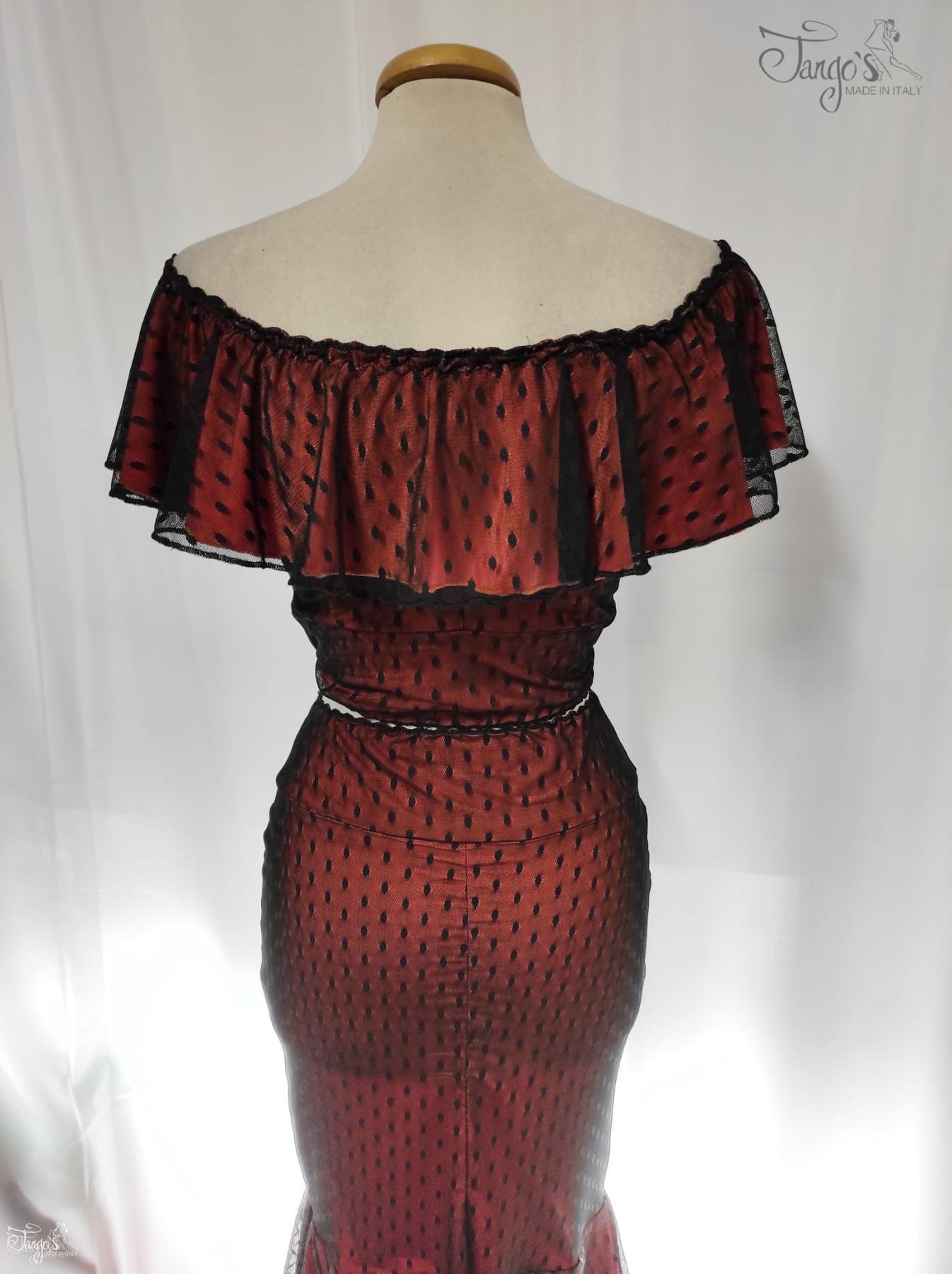 Gonna modello Dafne realizzata in morbido tulle nero a pois con fodera in maglina elasticizzata di colore arancione, ampia scollatura e volant sopra le spalle.