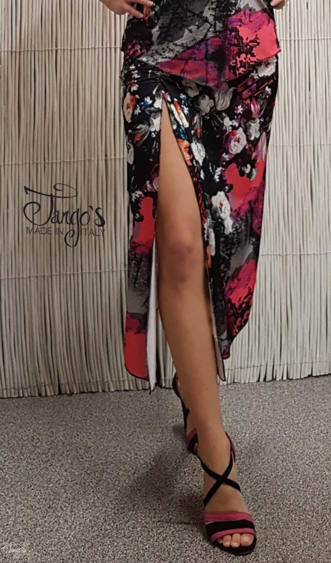 Gonna asimmetrica modello Dior realizzata in tessuto elasticizzato con fantasia astratta sui toni del bianco, grigio e rosa, ampio spacco sul davanti con increspatura.
