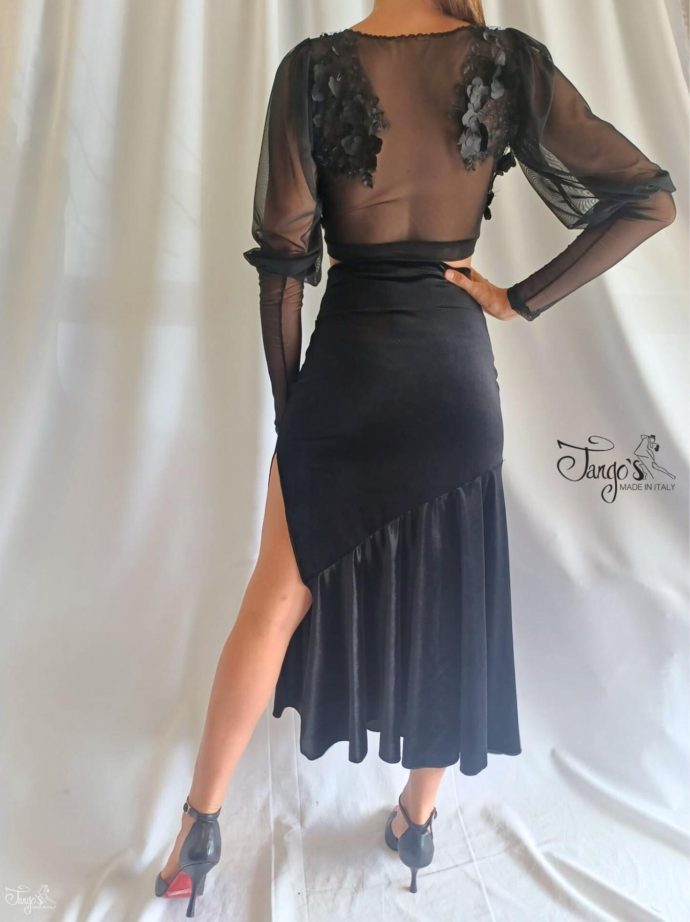 Top Malika in tulle nero con maniche lunghe e leggermente a sbuffo,Sul davanti e sul retro la parte superiore del busto è arricchita da applicazioni floreali in 3D tono su tono,che donano un effetto romantico e sofisticato.