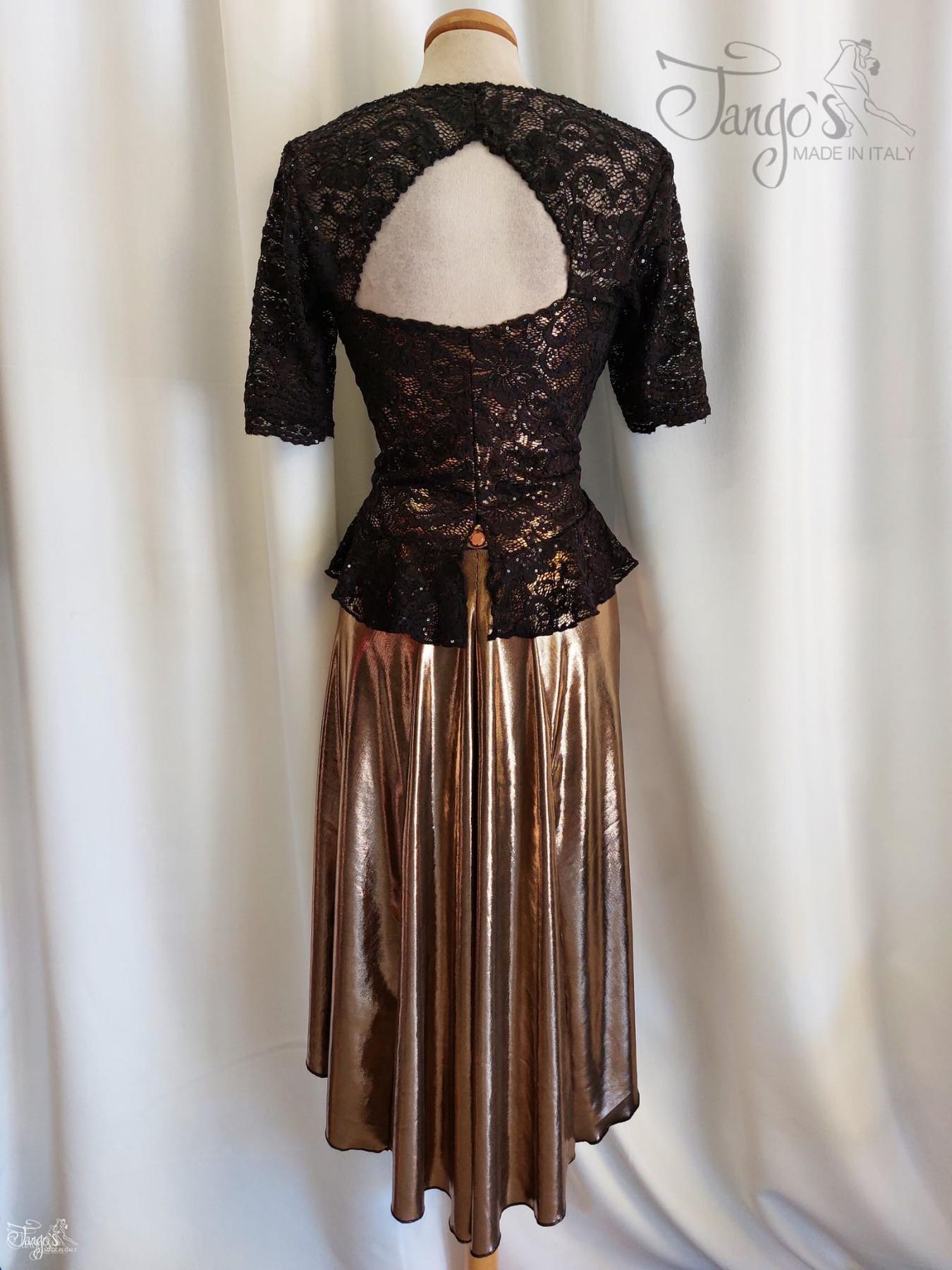 Top modello Tina modificato realizzato in pizzo nero con paillettes, parzialmente foderato con tessuto laminato elasticizzato color bronzo, manica corta, volant che conferisce svasatura, spacco sul retro e particolare svasatura sul retro.